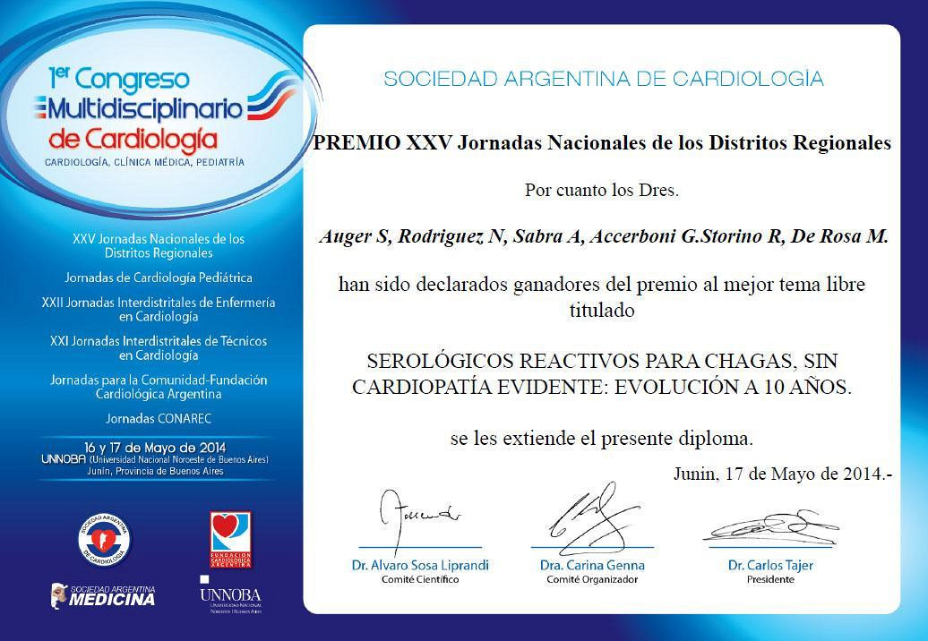 En el transcurso del XXIV Congreso Argentino de Cardiología, realizado, en forma muy destacada, en Buenos Aires entre el 19 y el 22 de octubre de 1997 se entregó, en su undécima versión, el Premio Fundación Dr. Pedro Cossio al mejor Tema Libre sobre Cardiología Clínica.